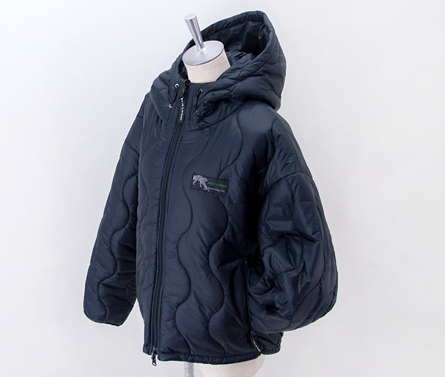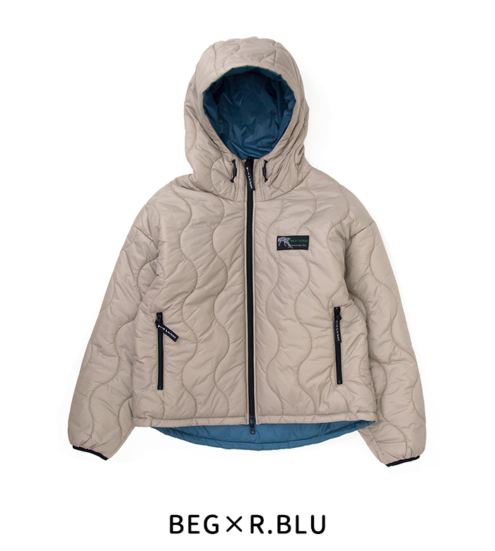 WILD THINGSより、リバーシブル ビレイジャケットが届きました! リバーシブルの中綿フードジャケットです。20Dのナイロン糸を使用した非常に軽く柔らかい生地で、リップストップで織ることで薄手の生地ながら耐久性に優れており、撥水加工により水にも強くなっています。プリマロフトブラックインサレーションは100%再生素材を使用した高性能の断熱中綿で、暖かく撥水性、耐久性に優れています。 表側は往年のWILD THINGSで人気を集めた波キルトに、WILD CATの旧ロゴ復刻ネームでレトロアウトドアな雰囲気に。裏側はステッチを表に出さず、ロゴもリフレクタープリントで、ソリッドで現代的な雰囲気となっています。ポケット内からドローコードで裾を絞ることができ、シルエットの変化も楽しめます。アーカイブと現代のWILD THINGSのデザインが融合し、それぞれを楽しめる工夫がされた1着。タウンユースはもちろんアウトドアシーンでも活躍してくれるオススメのアイテムです。