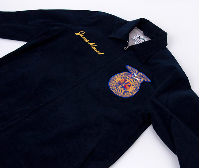 HOUSTONより、コーデュロイ刺繍ジャケットが届きました! 古着市場では人気と反比例して枯渇化が進んでおり、価格も高騰してきているFFAジャケットをHOUSTONオリジナルでサンプリングしました。FFA(Future Farmers Agriculture)ジャケットは1928年設立、アメリカの国立農業学校のユニフォームウェアで州ごとに違う刺繍、着用者の名前が施されているジャケットです。 保温性に優れた細畝のコーディロイ素材を使用しており、シーズンムードが高まります。FFAの刺繍ワッペンや右胸、背面ネーム部分のチェーンステッチなど当時のモデルを忠実に再現しています。ゆったりとした身幅のあるワイドシルエットで仕上げており、インナーに厚手の物も着こめるのも嬉しいポイント。ヴィンテージ感溢れる一枚で、アメカジやミリタリー系スタイルにピッタリのアイテムです。