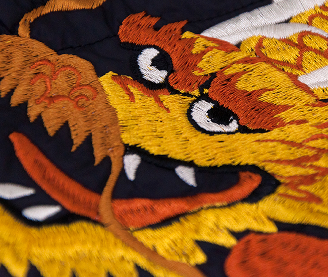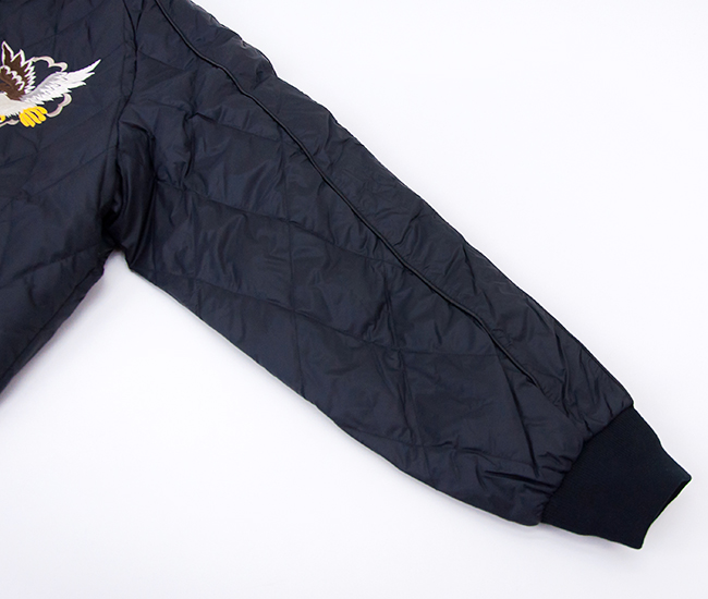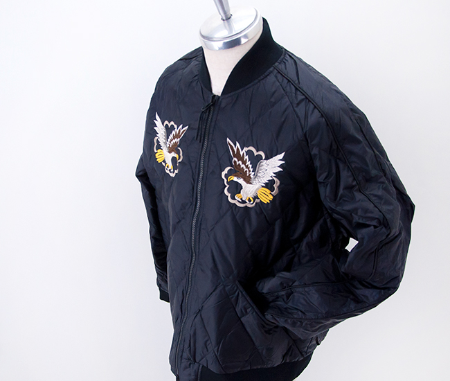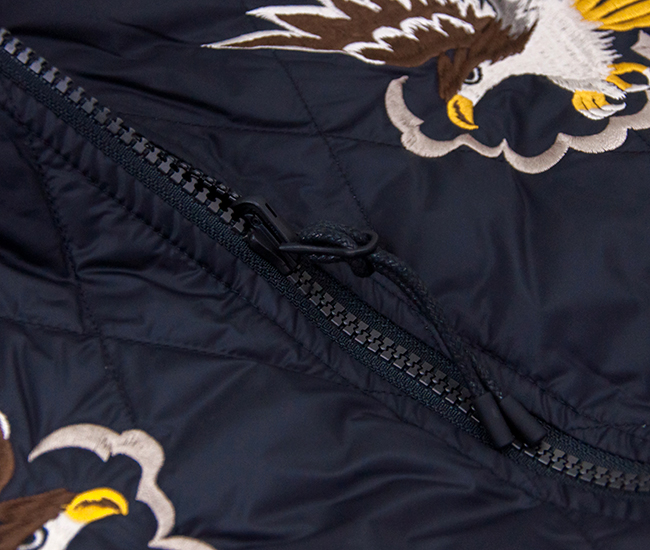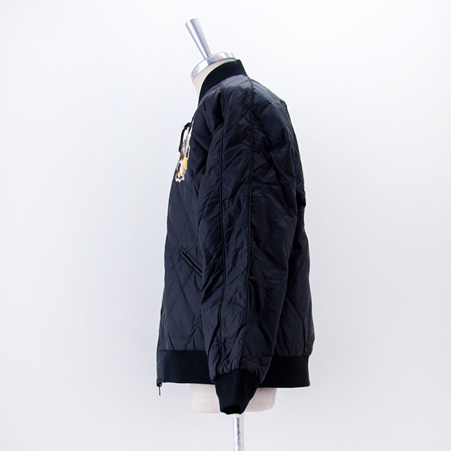TAIONより、ジャパンスペシャル リバーシブル スカジャン ダウンジャケットが届きました! スカジャンとダウンを組み合わせた、スカジャン風リバーシブルダウンジャケットです。表地はベロア生地に前後スカジャン風の刺繍を入れており、裏地は高密度ナイロン生地を使用。羽毛は軽くて反発力に優れた800FPの上質なダウンを使用しています。 表側はダイヤキルトで左右胸に鷲と後ろには龍のスカジャン刺繍を施し、裏側は配色のラグラン袖でスポーティーな雰囲気です。衿、袖口、裾に風合いのあるリブを使用。表側左右腰には片玉淵ポケット、裏側左右腰には両玉淵ポケットが付いています。肩まわりや身幅にゆとりをもたせたシルエットで、インナーに厚手のトップスを合わせてももたつかず、ストレスなく羽織れます。リバーシブル仕様なので、その日の気分やコーデに合わせて楽しめるアイテムです。