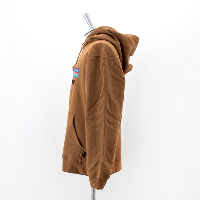 カンガルーポーチ型ポケット付き。パタゴニアのオリジナルアートをPVCおよびフタル酸エステル不使用のインクでプリントしました。ペットボトル14.9本とはぎれ生地372グラムを使用し、従来の方法で栽培されたコットン製スウェットシャツに比べ697リットルの水を節約するリサイクル素材95%で作られた環境に優しい一枚です。