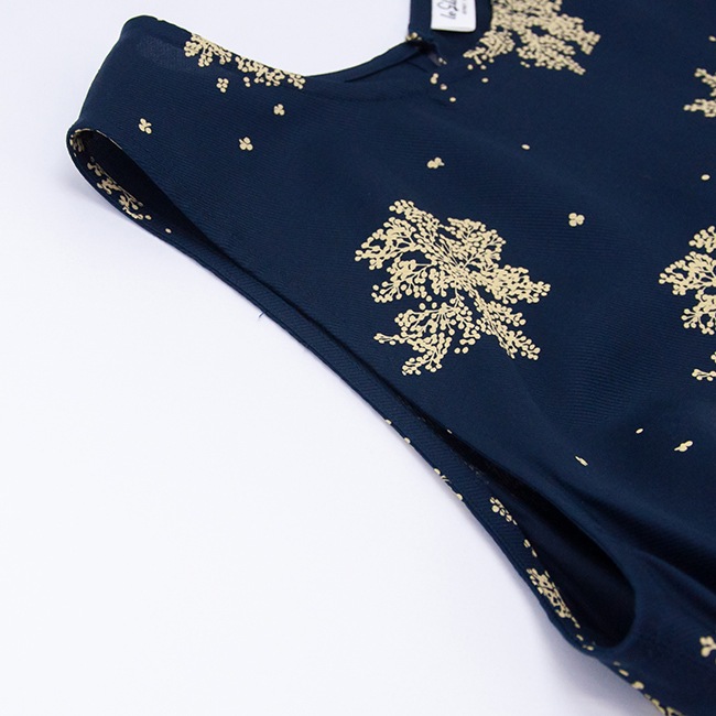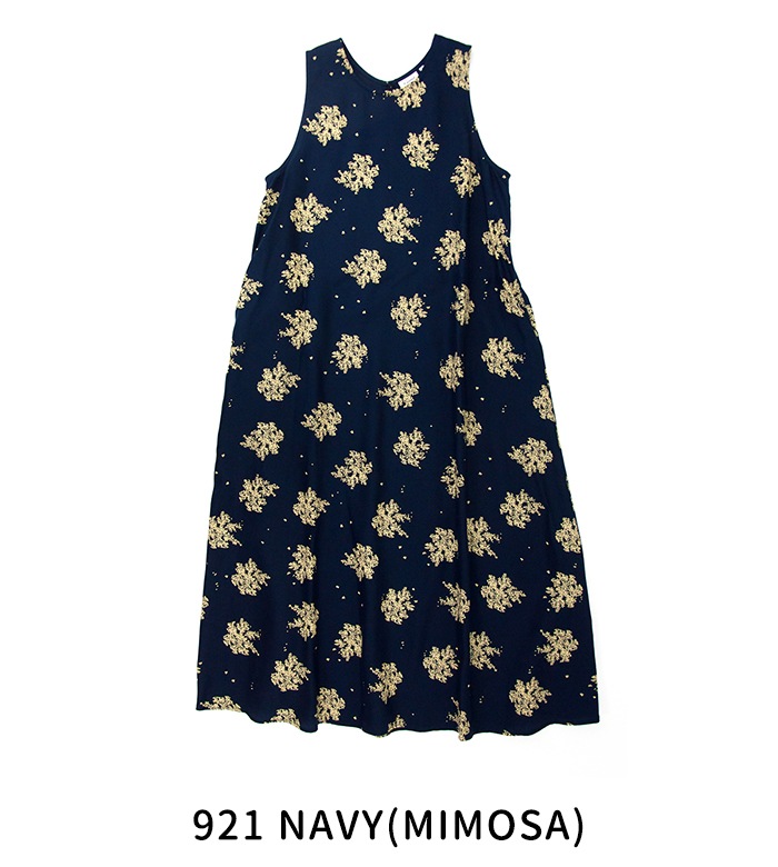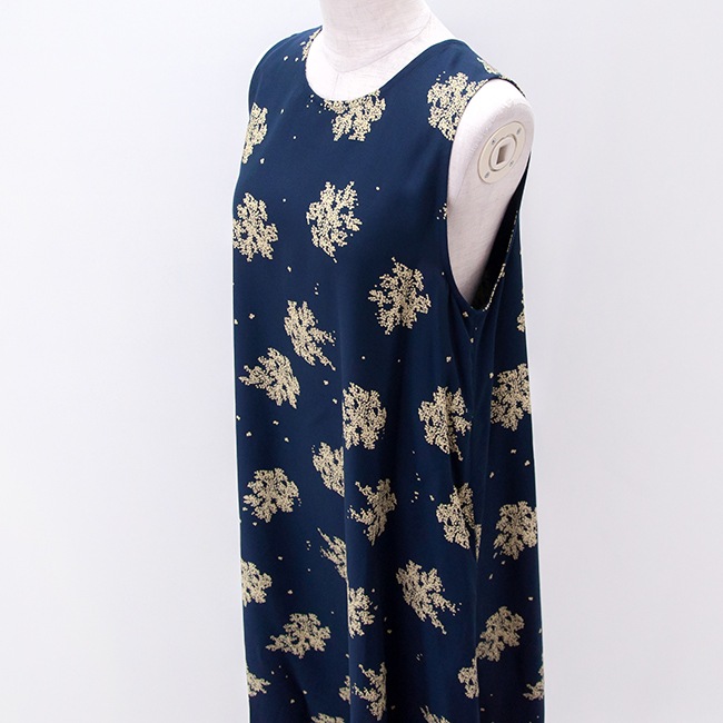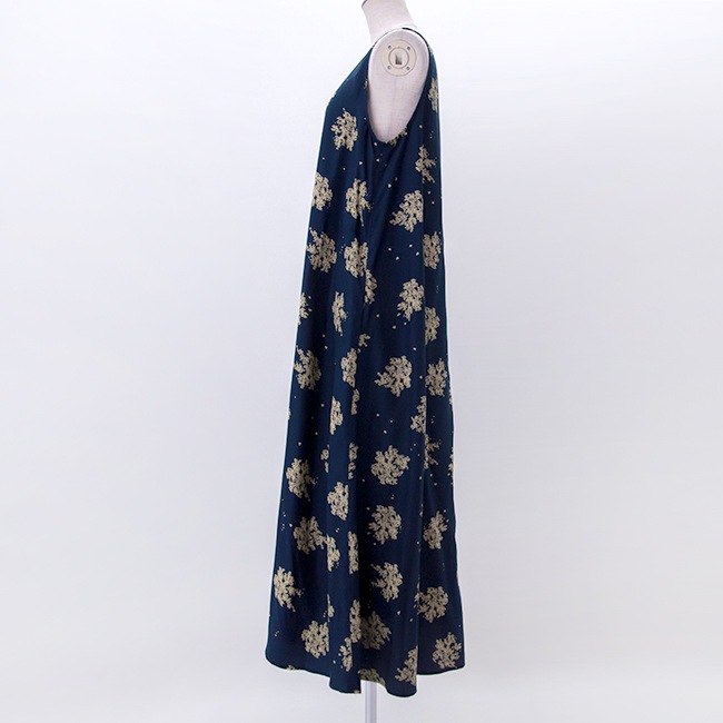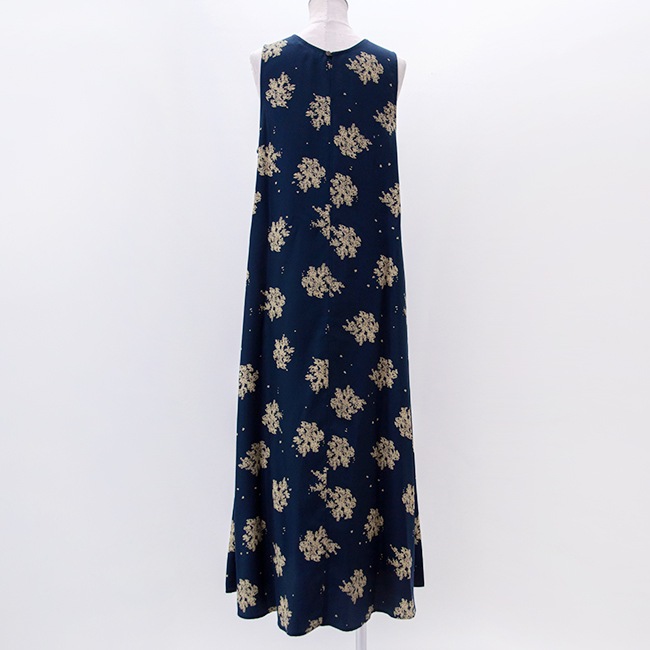 フレアラインのノースリーブワンピースです。パウダータッチが特徴のセルロース素材のツイル生地を使用しており、落ち感と程よい光沢感が特徴です。抜染プリント技法を用いたブランドオリジナルの花柄で、存在感は抜群。年齢を問わず着やすい落ち着いたデザインが魅力◎