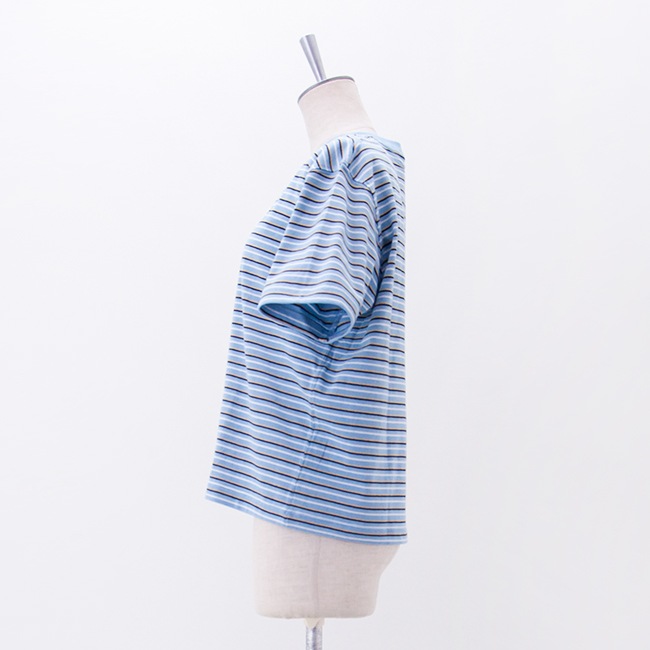 シンプルながら着回し力の高い、ショート丈のボーダーTシャツです。綿のリング紡績によるベーシックな糸を使用したソフトな風合いの天竺素材で、快適な着心地です。ショート丈の設計と肩から袖にかけてのラインの収まりが美しく、すっきりとした印象に仕上がっています。